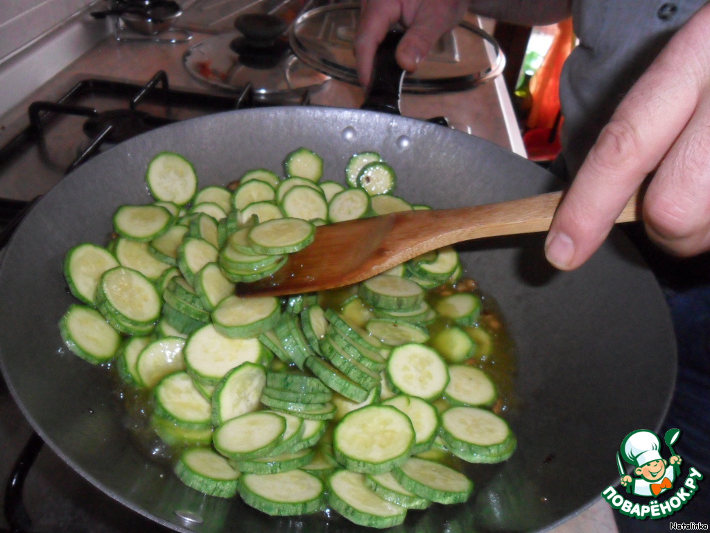 Когда поджарится чеснок, забрасываем кабачки.