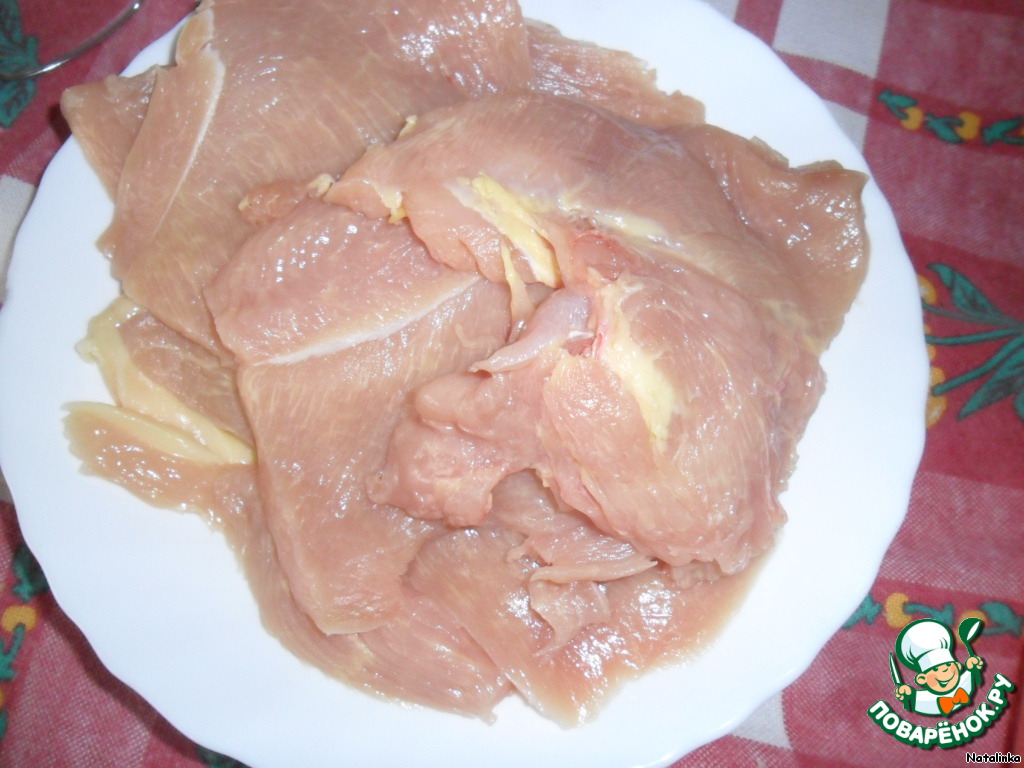 Нарезаем тонко куриную грудинку.
