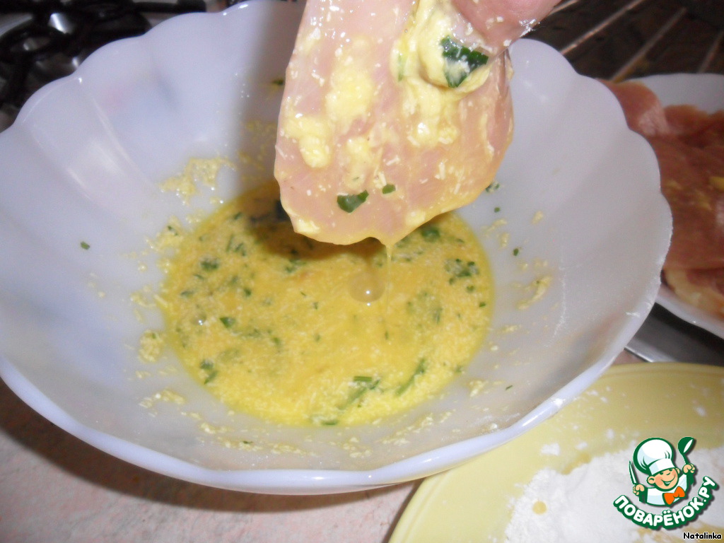 Мясо кладём в яйцо.