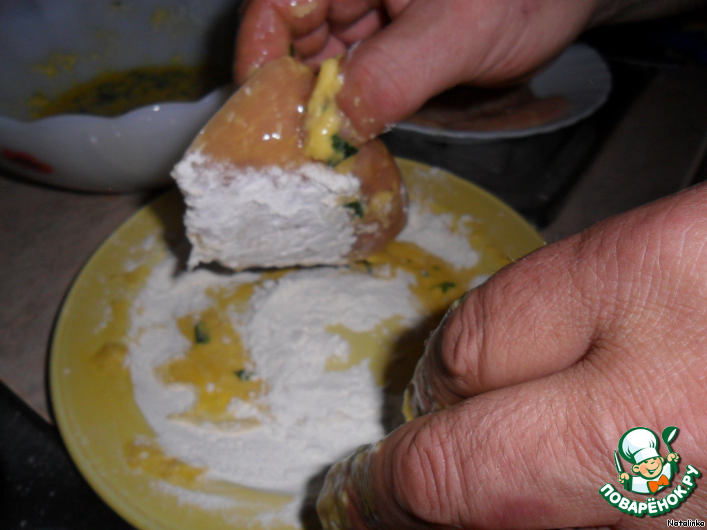 Обваливаем в муке. Мне нравится, когда снова из муки в яйцо, а потом снова в муку - корочка получается...мммм!!!