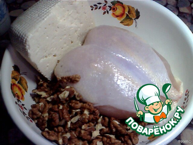 Вот продукты для начинки: брынза, куриная грудка, орехи.