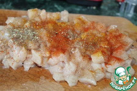 Филе моем, режем на небольшие кусочки, солим и посыпаем специями, у меня перец молотый, паприка, куркума, пряные травы.