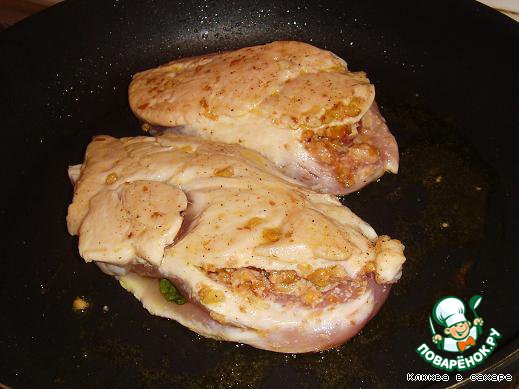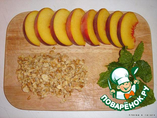 Глубокие внутренние "карманы" плотно набиваем дольками персика, обваленными в толченых орехах. Если дольки в процессе сомнутся, ничего страшного.