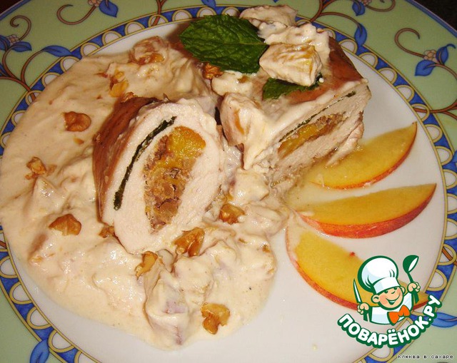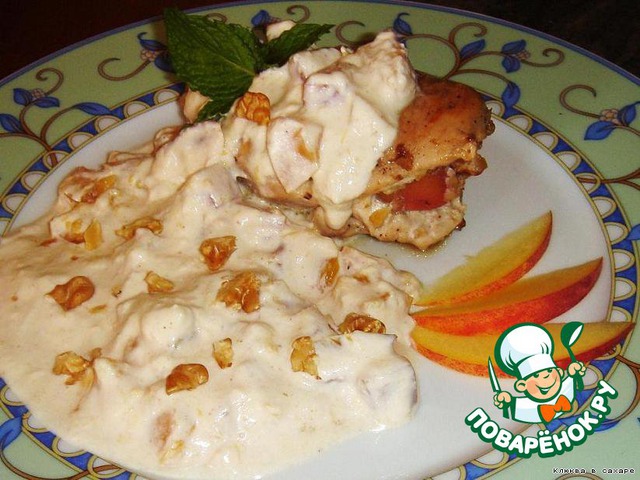 | Недавно увидела по телевизору этот рецепт в виртуозном исполнении повара одного из ресторанов. Процесс был таким аппетитным, что я, недолго думая, решила приготовить. В результате получилось абсолютно гурманское блюдо: персик, мята, сливки и орехи сотворили с курицей чудо! |