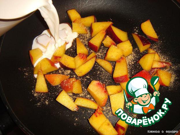 Пока жарится птица, займёмся соусом. Для этого режем на средние кусочки второй персик. Выкладываем его на сковородку, посыпаем молотым имбирём, заливаем сливками и включаем средний огонь.