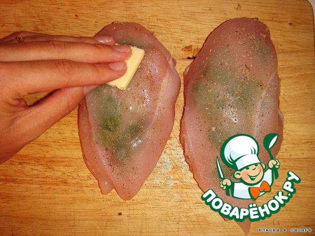 Нафаршированные грудки солим, перчим и обмазываем во всех сторон кусочком сливочного масла для того, чтоб они равномерно поджарились.
