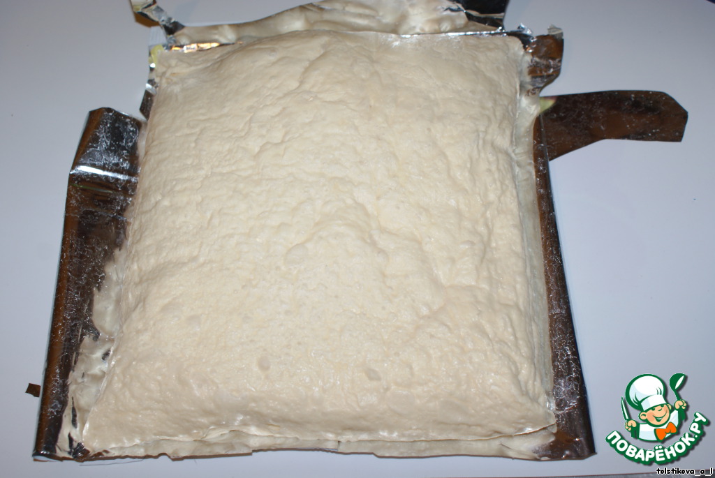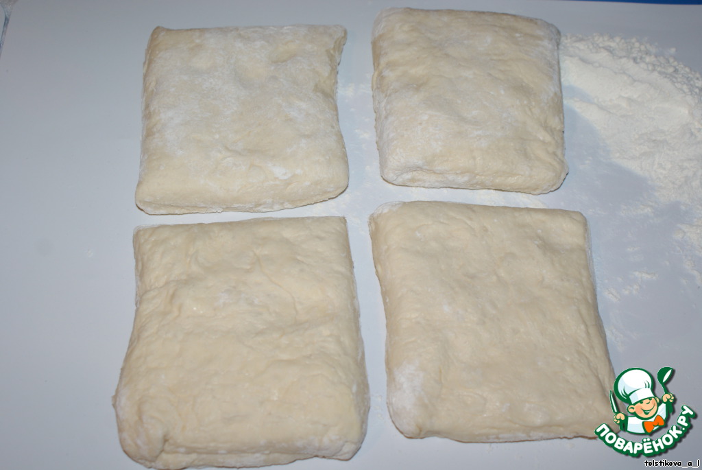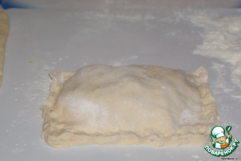Разморозить слоеное тесто (я его оставила на ночь в холодильнике, и вот так хорошо оно у меня поднялось).