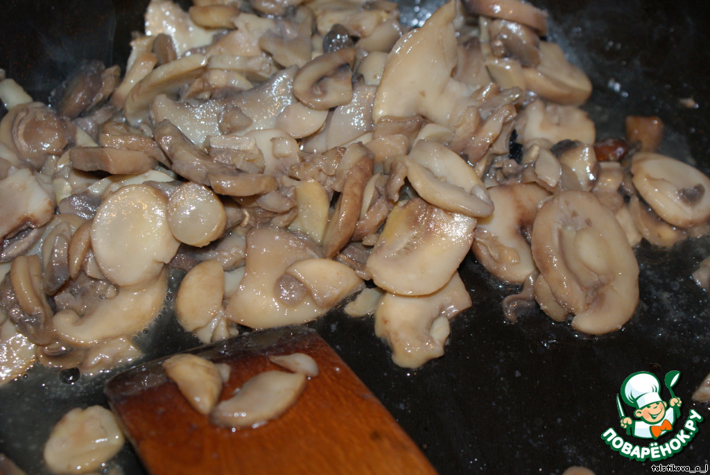Грибы обжарить на подсолнечном масле (у меня были замороженные шампиньоны, и я обжаривала пока не выпарится вся жидкость)...