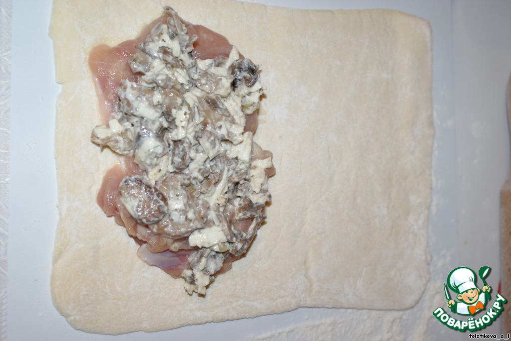 Из теста раскатать прямоугольник. На край уложить куриное филе, как у меня на фото, на филе грибы.