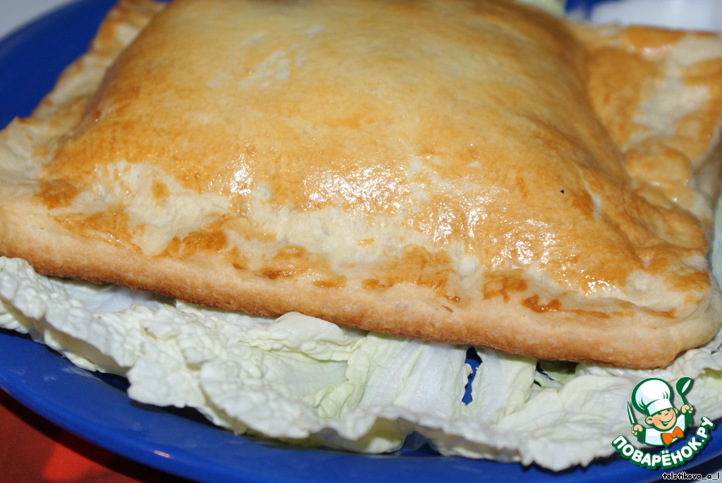 Соединяем конвертом, прижимая края руками. Смазать конверты желтком (этот шаг я не сфотографировала)и отправить в предварительно разогретую духовку примерно на 20 мин. Когда конверты подрумянятся - все готово!