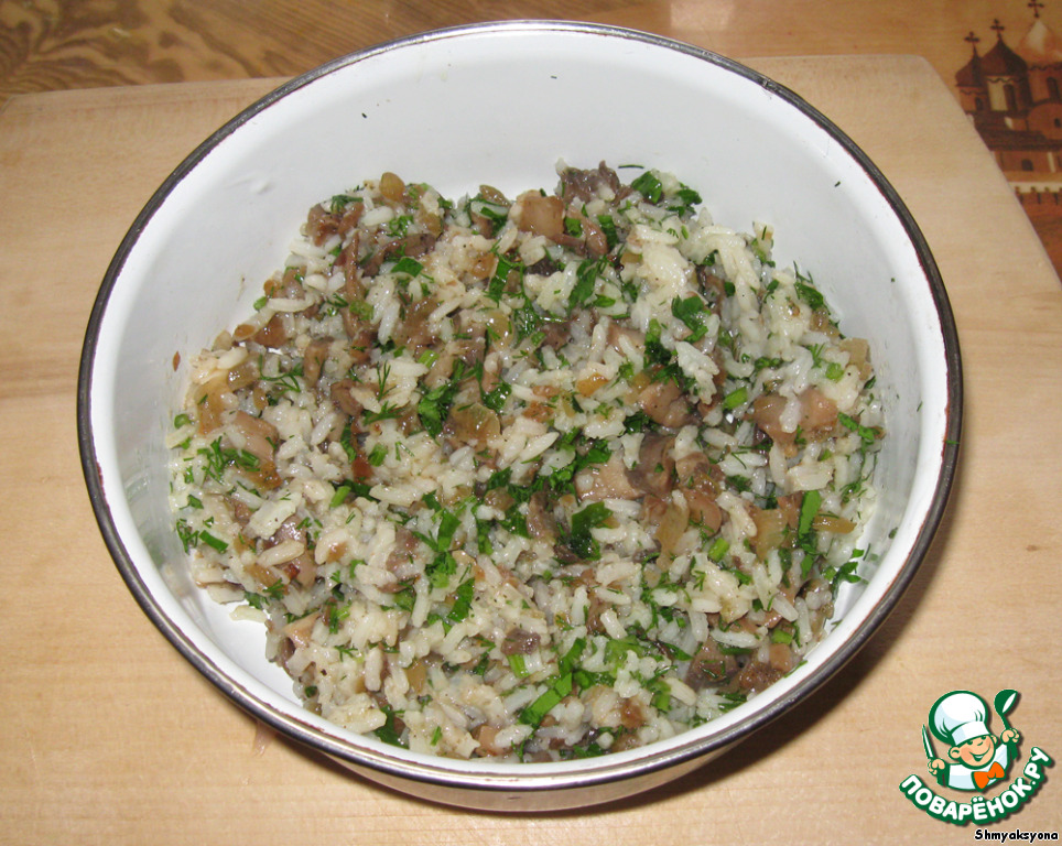 Итак, начинка: лук мелко нарезать и обжарить на растительном масле до золотистого цвета, добавить нарезанные шампиньоны, жарить до готовности грибов, в самом конце посолить, добавить специи и отваренный рис.