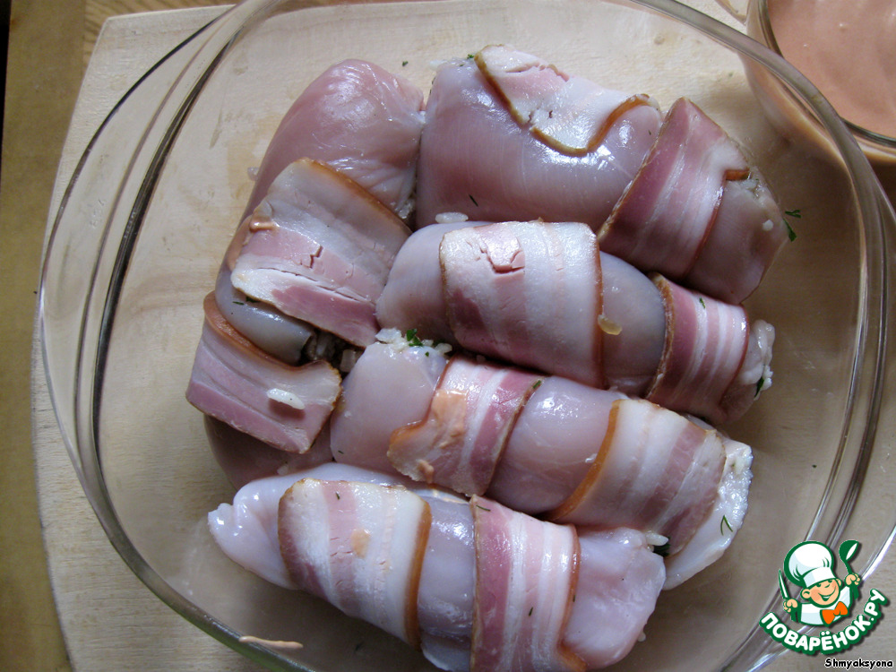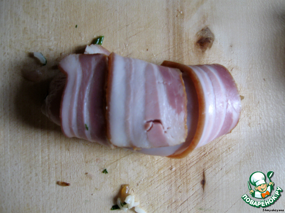 Оборачиваем каждый ленточкой бекона. Если берете фасованный порционный бекон в вакуумной упаковке, выбирайте тот, в котором больше прослоек сала, он эластичнее. Такой бекон с широкими прослойками мяса частенько ломается при обертывании.