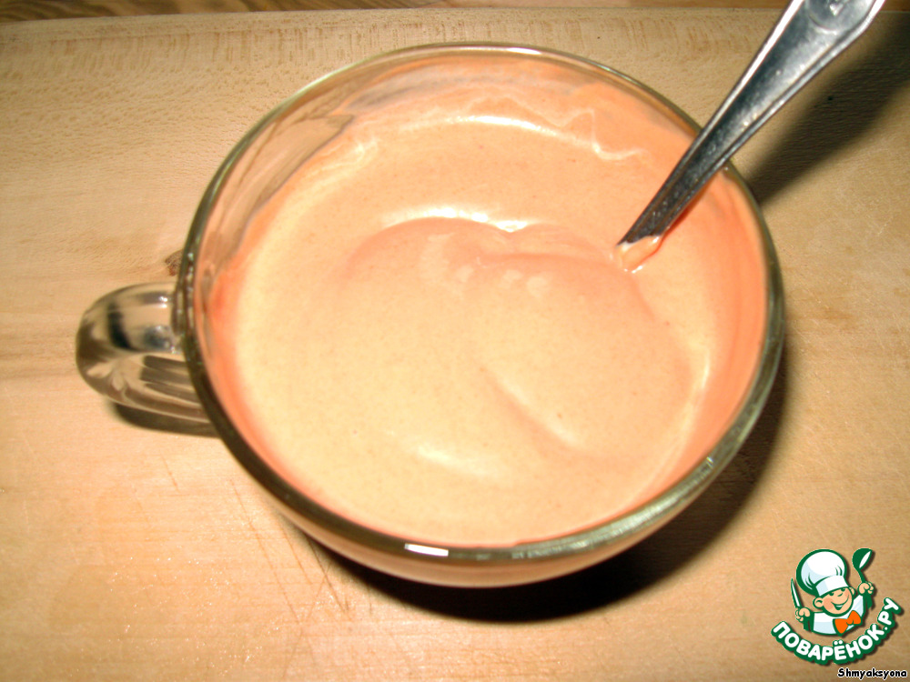 Приготавливаем соус, смешав майонез, томатную пасту (кетчуп) и горчицу. Такой порции соуса хватит на 5-6 кармашков, а если готовим больше, то количество ингредиентов в соусе удваиваем или утраиваем.