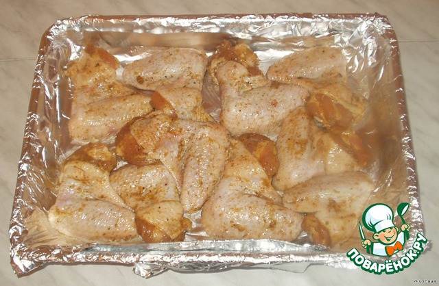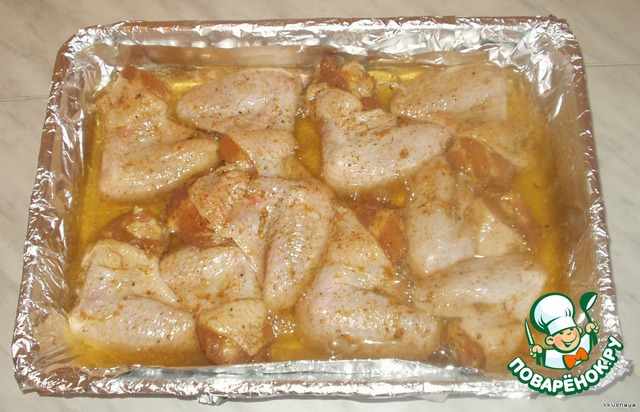 По прошествии времени, выкладываем крылышки в форму для запекания (я предпочитаю предварительно выстилать форму фольгой)