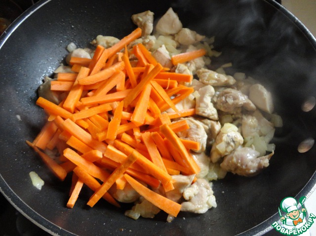 После того, как филе чуть обжарится, добавляем лук и жарим до тех пор, пока лук станет мягким (минуты 2).
