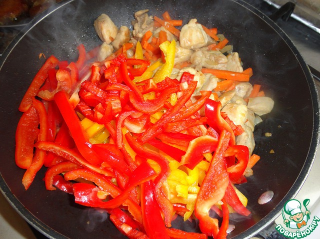 Добавляем соус к курице с овощами и аккуратно перемешиваем, пока соус не загустеет.