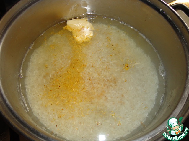 Далее в кастрюлю кладем 2 стакана промытого риса, 4 стакана воды, маргарин, карри и соль. После закипания варим минут 10-12 с открытой крышкой на не очень сильном огне.