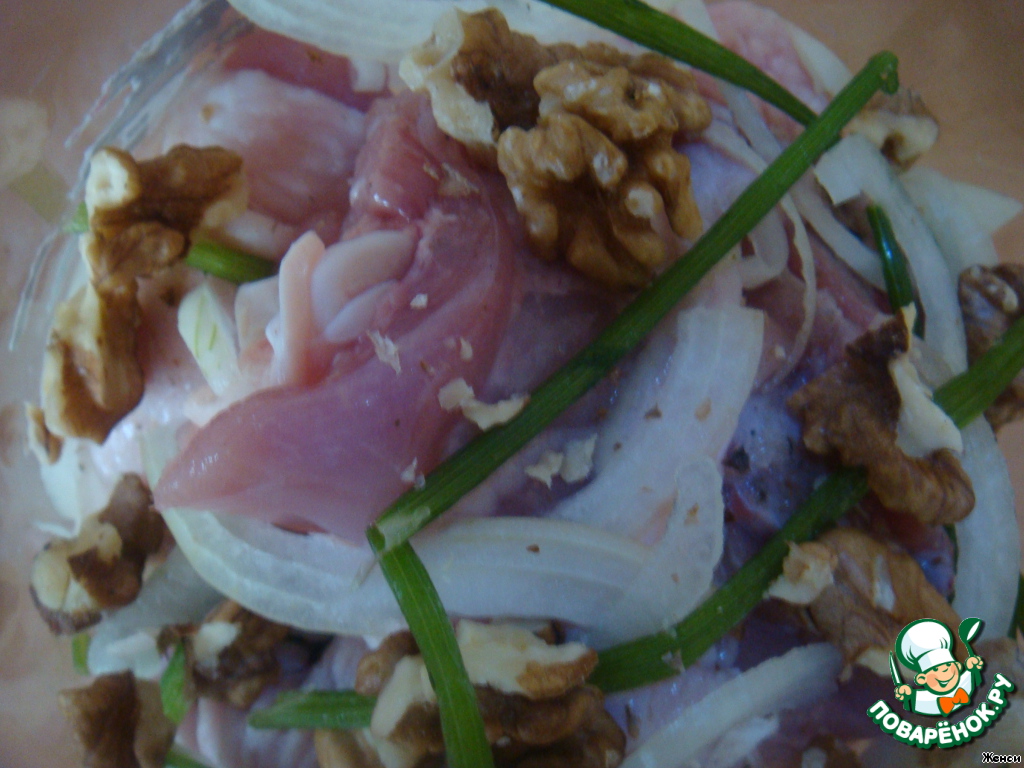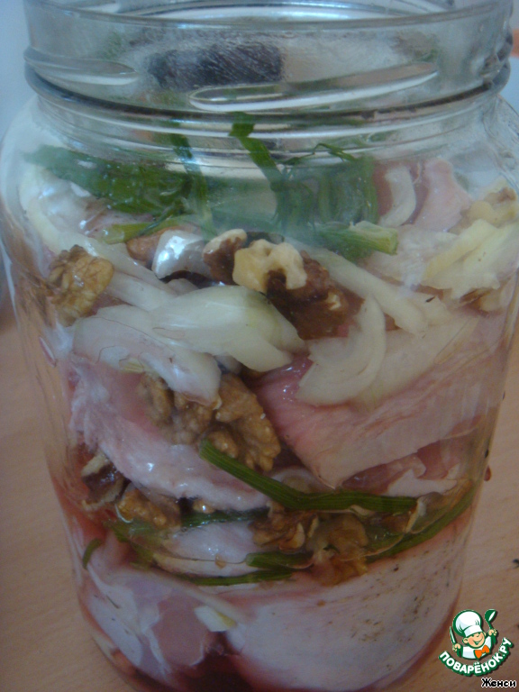 Духовку разогреть до 190С. Укладываем курочку в банку - на дно - оливковое масло, чесночку, немного укропа, курицу, грецкие орехи (таким образом перекладываем слоями). Заливаем вином. У меня ушло 130 мл. примерно, зависит от степени наполненности банки. Нужно залить вином банку не до конца, оставить сантиметров 5-7, так как курочка еще пустит сок во время готовки. Сверху присыпаем укропом с чесноком.