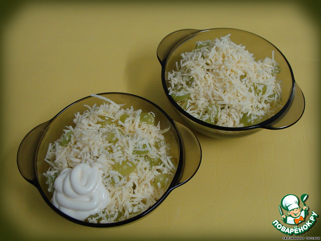 Сыр натереть на мелкой терке. Виноград освободить от веточек, помыть, высушить и нарезать на половинки.