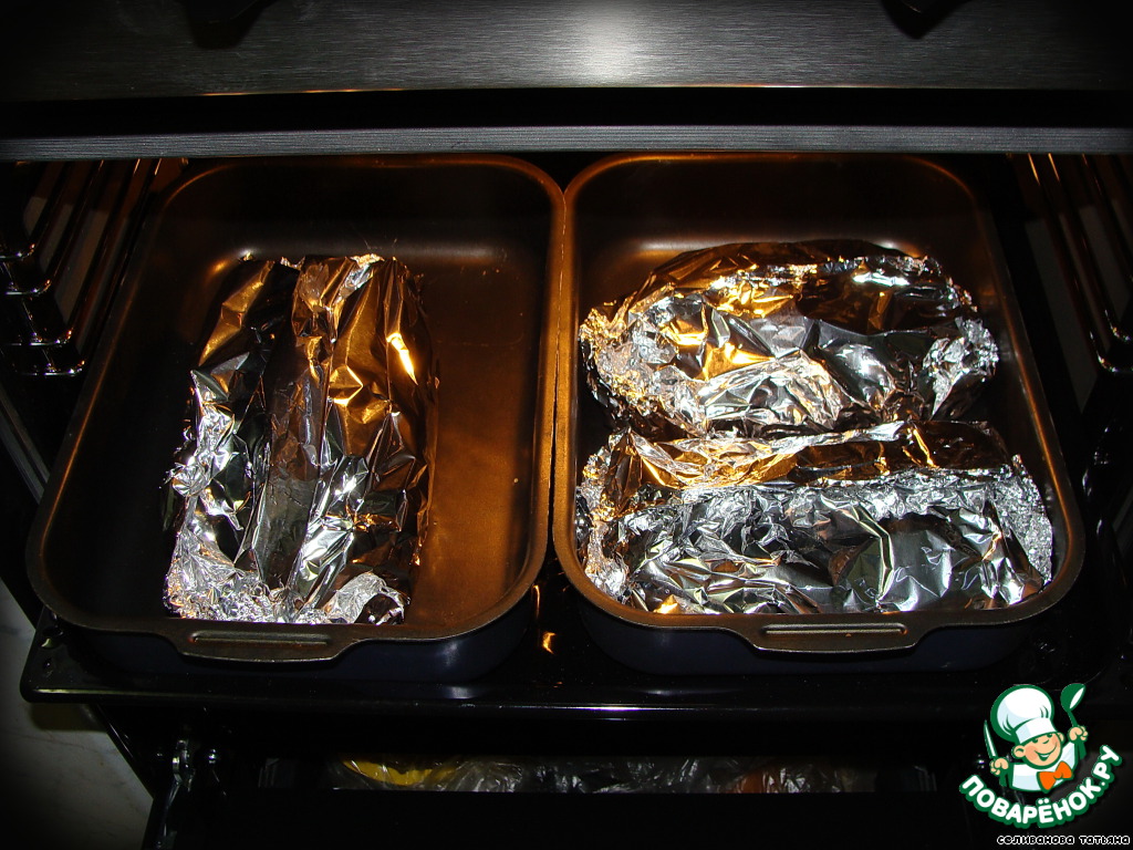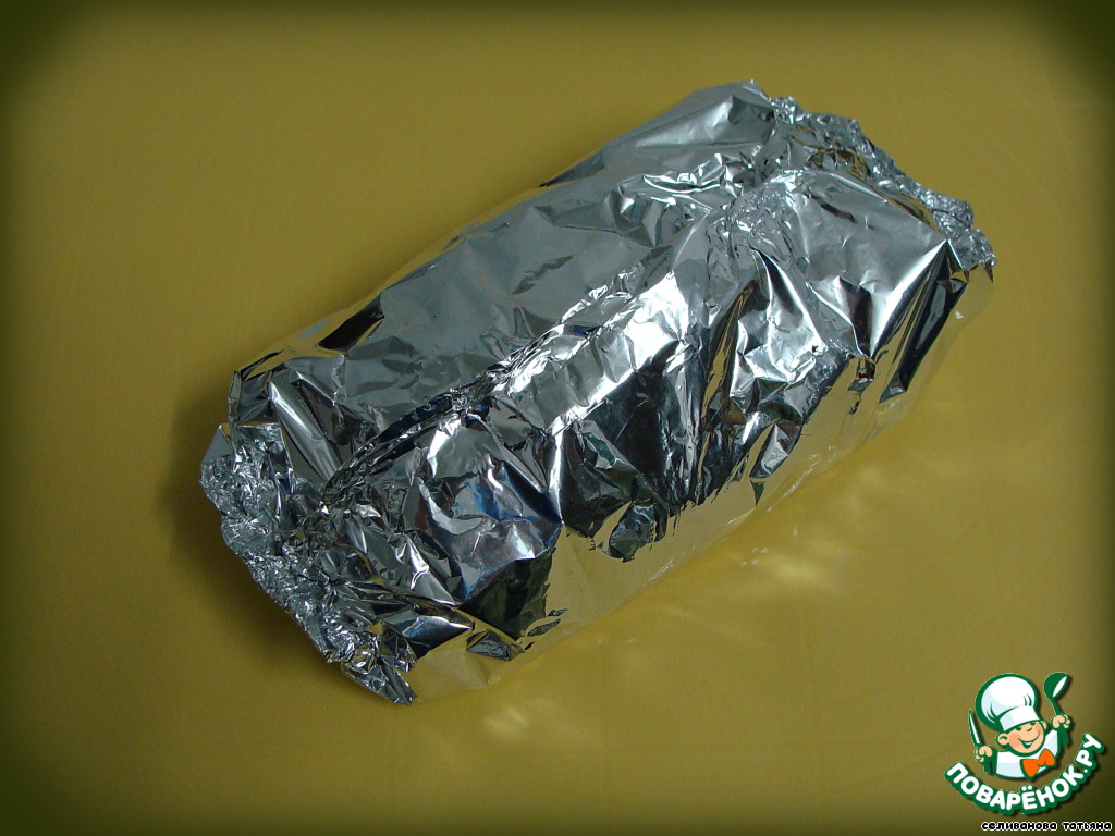 Обмазать майонезом и завернуть в фольгу.