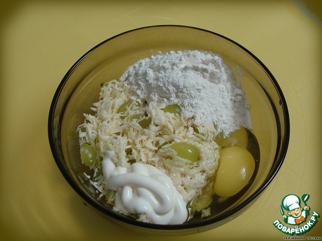 Тем временем ко второй части сырной смеси добавить 1 ст.л. майонеза, яйцо и муку. Посолить и перемешать.