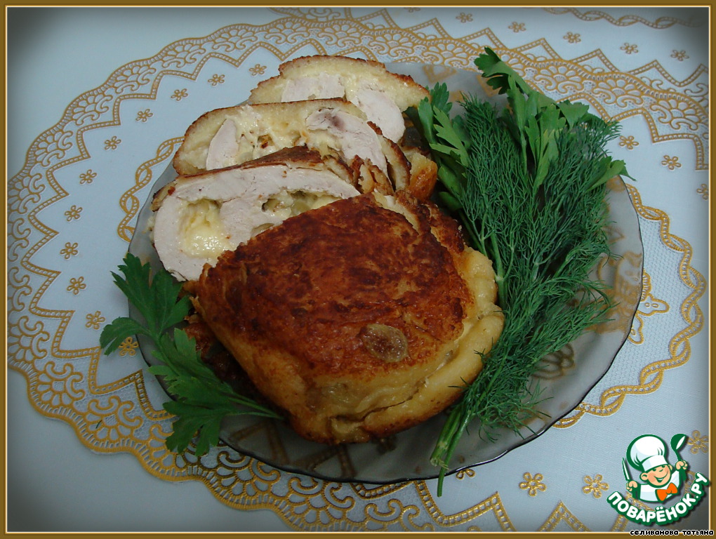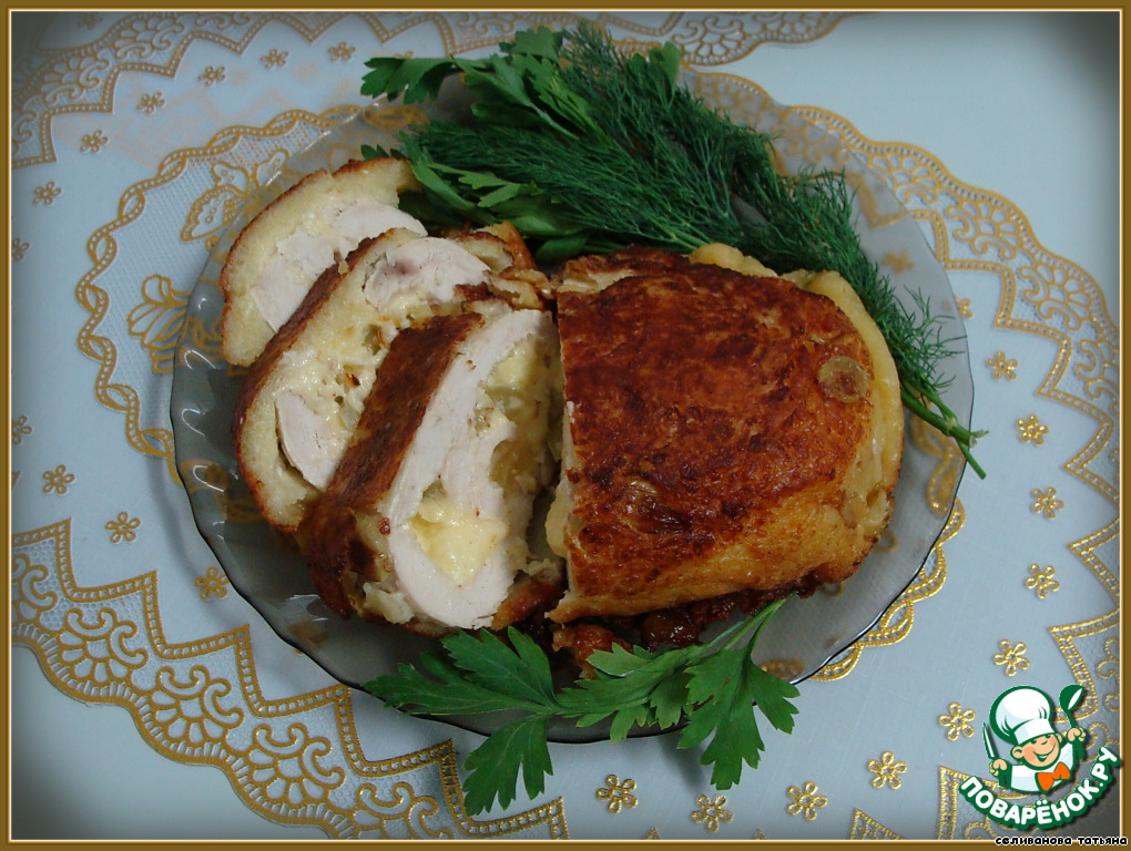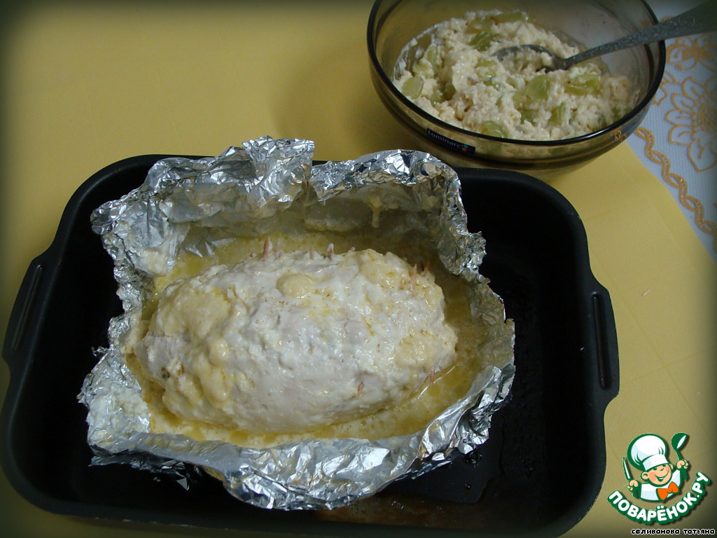 Подготовленную смесь выложить на куриную грудку, аккуратно ее свернуть ...
