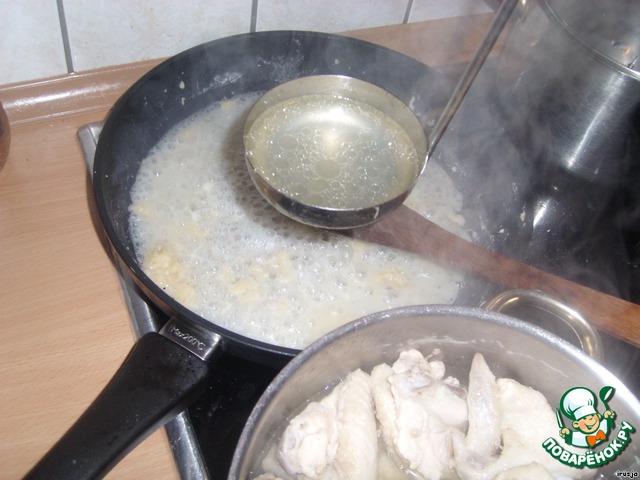 Далее по одному половнику доливать ГОРЯЧИЙ бульон, не забывая тщательно растирать комочки муки.
