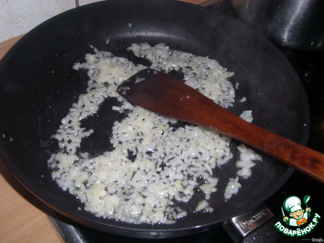 Лук мелко порезать и обжарить в растительном масле. Скорее даже не обжарить, а потомить до прозрачности.