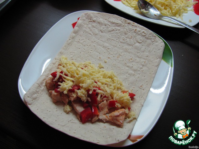 Самый ответственный этап. Когда все ингредиент готовы и курица немного остыла, начинаем выкладывать начинку на лепешку. Пару ложек курицы, болкарский перец и сыр. Чем больше сыра, тем вкуснее:)