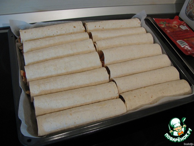 Завернутые буритосы выкладываем на противень, застеленный предварительно бумагой для выпечки.