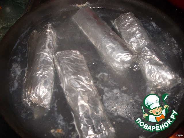 Колбаски в фольге выкладываем в глубокую сковороду , наливаем воду и под крышкой тушим около часа. Даем остыть и разворачиваем.
