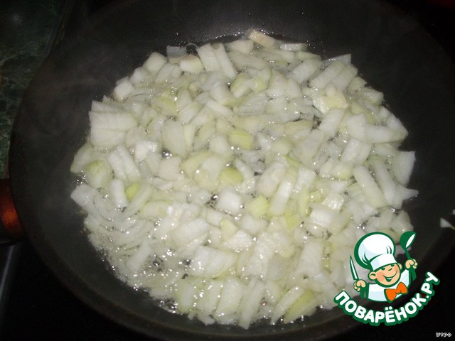 Лук режем и тушим в масле на небольшом огне.Добавить соль и специи.