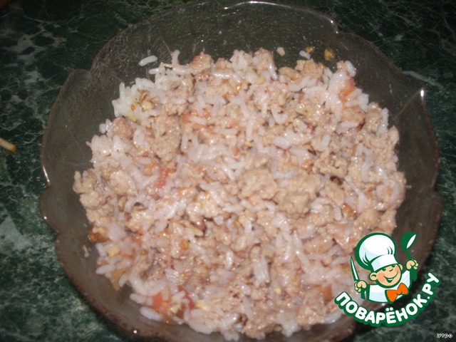 Фарш тушим до готовности с небольшим количеством масла. Добавляем рис, орешки, тертый без кожи помидор и специи. Размешиваем.