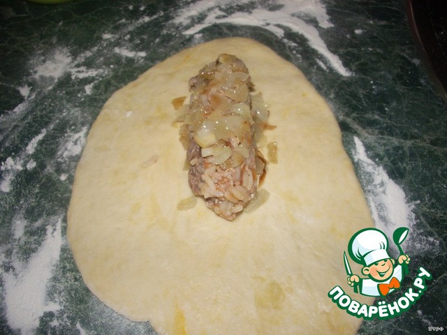 Тесто делим на 4 части, раскатываем довольнотонко.Выкладываем дорожку лука, на нее колбаску нашу и сверху еще лук.