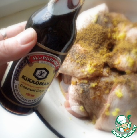 Перекладываем курицу в подходящую для маринования посуду. Добавляем перец, кориандр и имбирь. Корень имбиря я натираю на терке и еще дополнительно отжимаю через чеснокодавилку (чтобы избавиться от крупных грубых волокон - не люблю я их). Вливаем буквально паку ложек соевого соуса. Перемешиваем и оставляем мариноваться на час-другой.