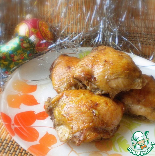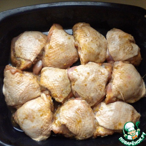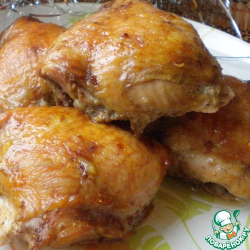 Разогреваем духовку примерно до 200 градусов. Выкладываем бедра на противень и отправляем в духовку минут на 40 - на час до готовности. Ближе к концу запекания поливаем бедрышки выделившимся соком.