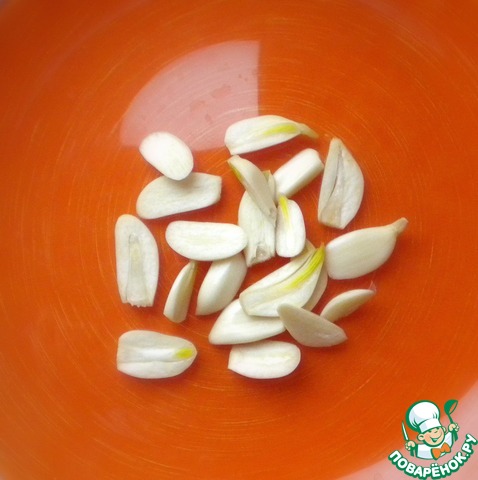 Начнем с того, что нарежем чеснок пластинками.