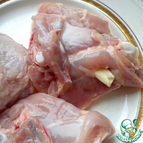С куриных бедрышек срежем лишний жир. С внутренней стороны (где нет кожи) нашпигуем их чесноком (2-3 пластинки чеснока на бедро). Полностью прячем чеснок в мясо.