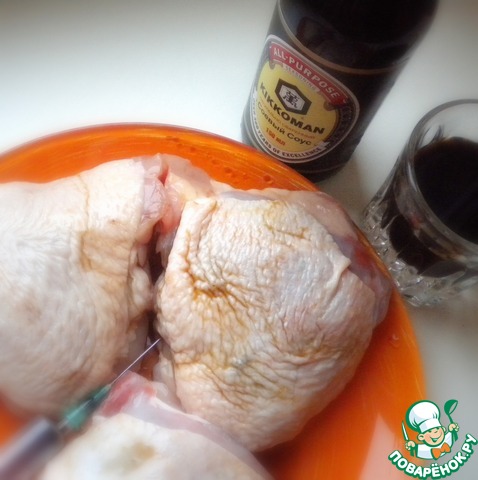 А теперь займемся "иглоукалыванием". Я беру обычный медицинский шприц, набираю в него соевый соус и обкалываю бедро в нескольких местах. На одно бедро нужно примерно 4-5 мл соевого соуса.