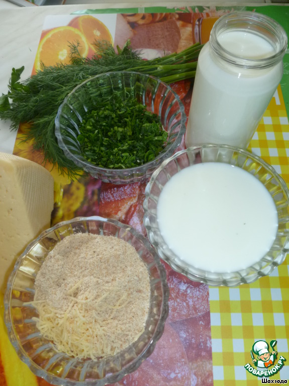 Натереть сыр, смешать его с панировочными сухарями, нарезать мелко зелень, влить молоко в тарелочку (выложить все по отдельности на тарелочки, не смешивая)