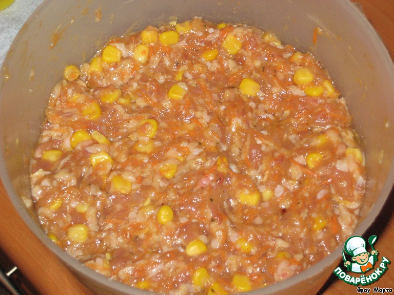 Соединить все ингредиенты - фарш, лук, морковь, кукурузу, перемешать, посолить, можно добавить любимые специи. Вбить одно яйцо, все хорошо перемешать.