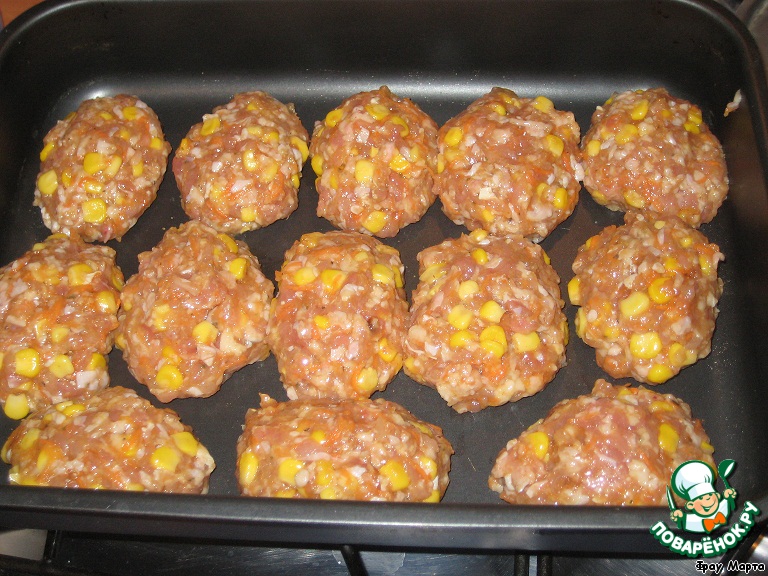Сформировать котлетки и выложить их на противень, немного долить водички. Поставить запекаться при температуре 200°С примерно 30 минут.