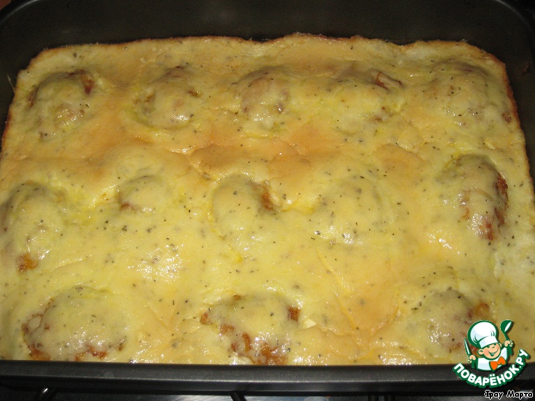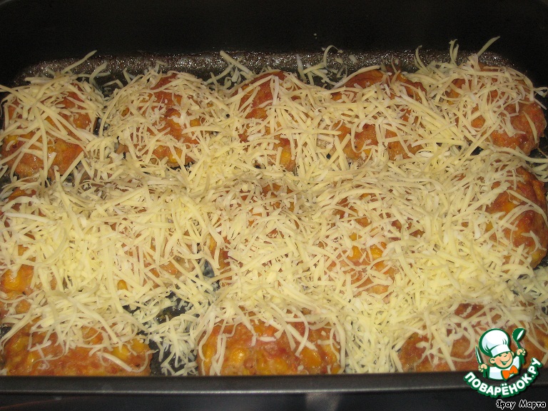 Котлетки, которые уже запеклись, достаем из духовки, посыпаем потертым на мелкой терке сыром.