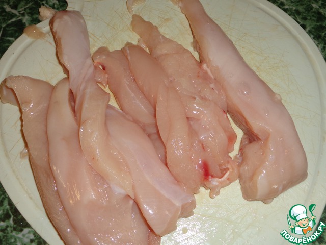 Каждое филе разрезаем на 4-5 длинных кусочков.