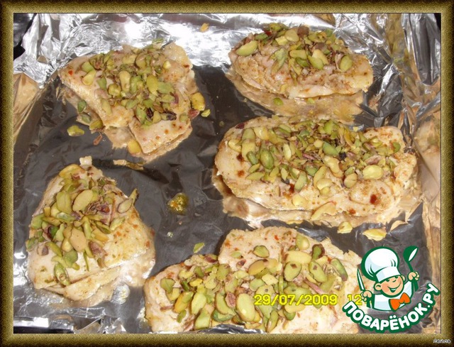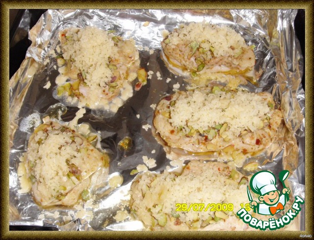 Переложить на фольгу,сверху обсыпать фисташками(чтобы держались фисташки,слегка сверху по несколько капель налейте раст.масло),кладем в духовку на 180-190* мин.на 20