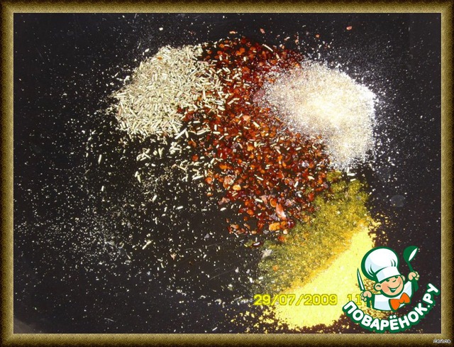 В миску налить растительное масло,специи,(розмарин-1 ч.л. паприка по вкусу,соль по вкусу,сухой чеснок-1 ч.л,карри -1 ст.л.-для остроты)