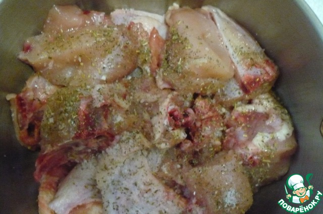 Курочку помыть и разделать на небольшие кусочки. Посыпать солью и прованскими травами. Вы можете взять любые специи, которые любите.