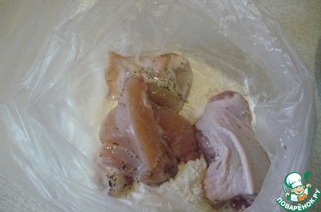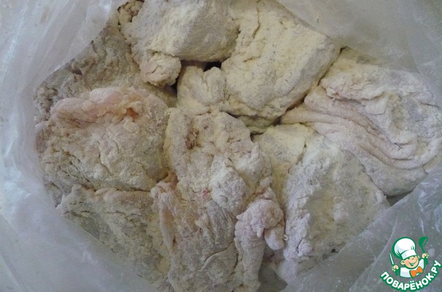 После того как время прошло мы берем обыкновенный пакет. Насыпаем туда муку, присаливаем и кладем туда кусочки курицы.