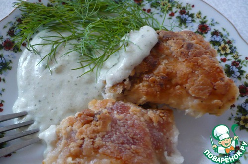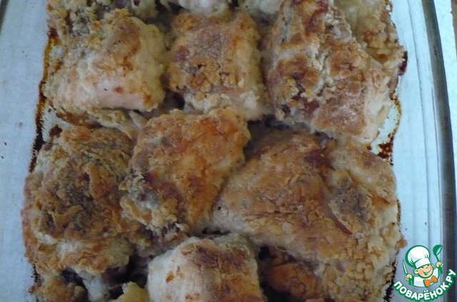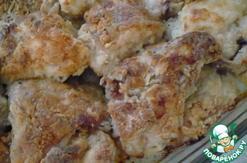 Курочка получается очень сочная за счет обжаренной корочки из муки.
