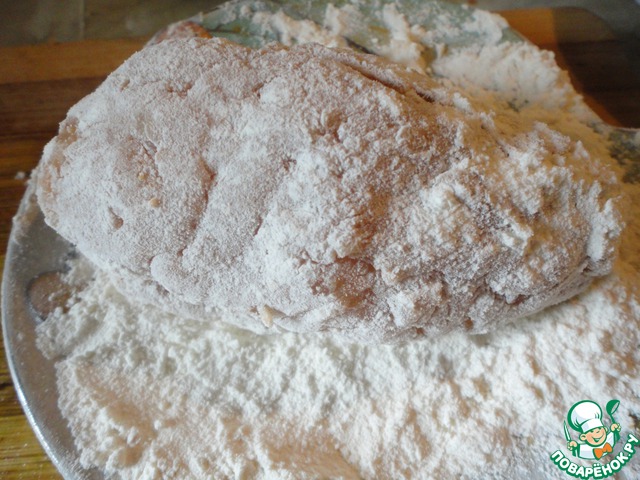 Далее обваливаем котлету в муке. Это обязательно нужно, чтобы панировка хорошо схватилась с мясом.